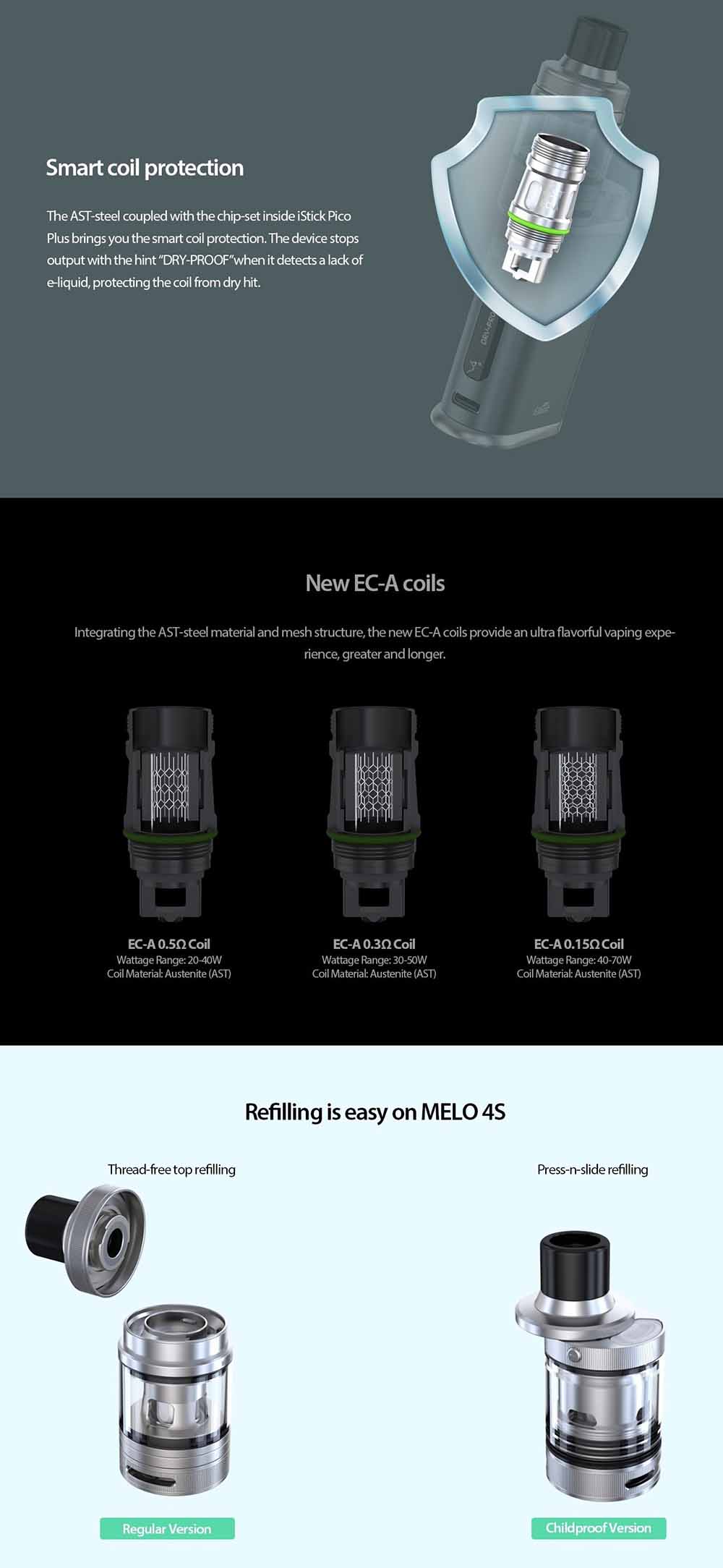 Üst kapağı çevirerek açılan temiz ve hızlı bir üstten dolum sistemi ile tek seferde 4 ml'ye kadar likit doldurulabilir. Melo 4S tankının en büyük teknik özelliği ise yeni EC-A, EC ve EC2 coil serileri ile uyumlu olarak çalışmasıdır. Bu atomizer başlıkları, daha üstün bir buhar keyfi sağlamak için yenilikçi AST-Steel teknolojisini kullanır. EC-A coil, geleneksel sargılar yerine özel malzemeler ve ağ şeritleri kullanır. Avantajları: coil'in yıldırım hızında ısınması, belirgin tat iyileştirmesi, geliştirilmiş güvenilirlik ve daha uzun kullanım ömrü. Paket içeriğinde 0.3ohm ve 0.5ohm EC-A coil'ler bulunmaktadır. Ergonomik 510 drip tip, DL ve RDL buharlaştırma etkisine en uygun şekilde uyum sağlar. Ayrıca, serbestçe ayarlanabilen alt hava akışı yeni EC-A coil ile birlikte çalışır.