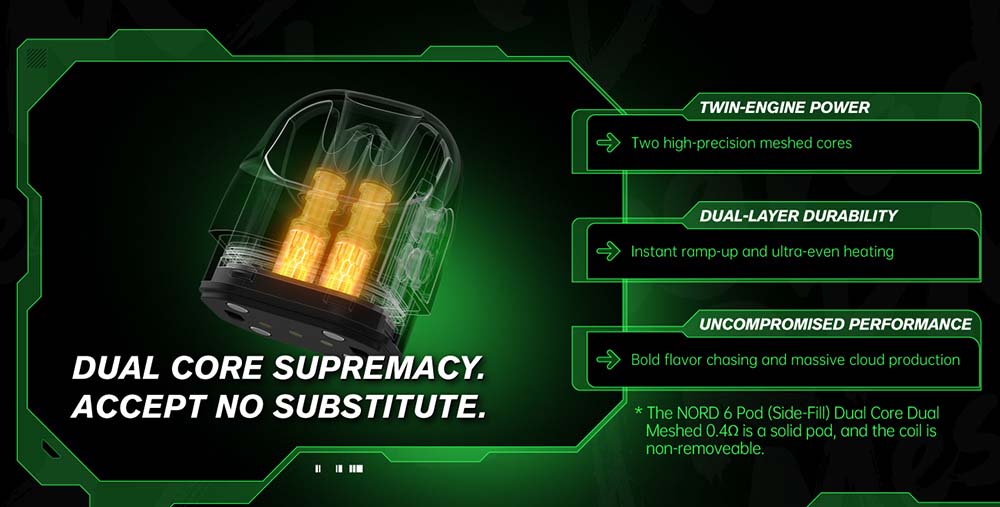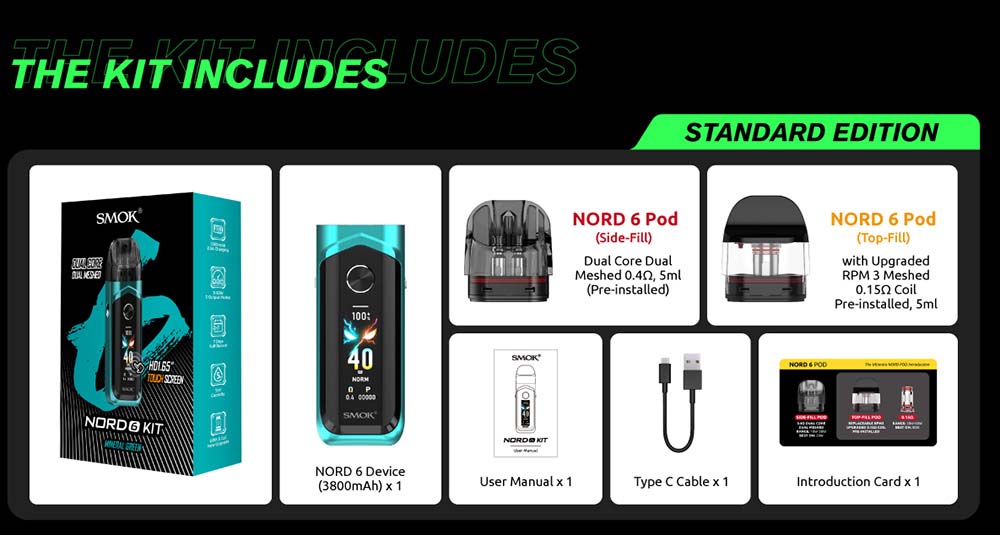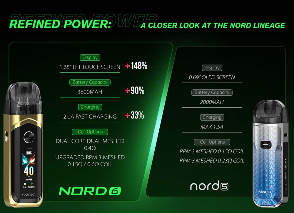 Nord 6 cihazı eski versiyonları olan Nord 5 ve Nord 4 cihazlarına göre çok büyük değişikliklere sahiptir. Özellikle kartuş yapısında ciddi değişikliğe gidilmiş durumda. İki farklı kartuşla gelen Smok Nord 6 Cihazının: