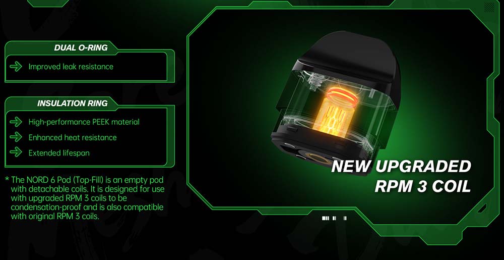 Üstten Likit Dolum Sistemine Sahip Kartuşu: Değiştirilebilir coil yapısındadır ve RPM3 coilleri ile uyumlu çalışır. Yani Nord5 ile aynı yapıdadır.